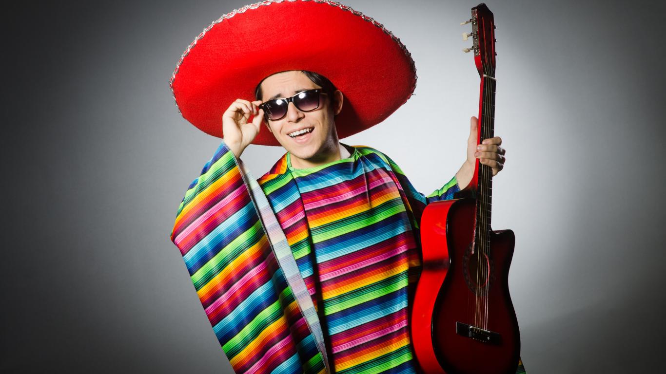 Wallpaper A man in a red sombrero with a guitar in his hands on a gray background