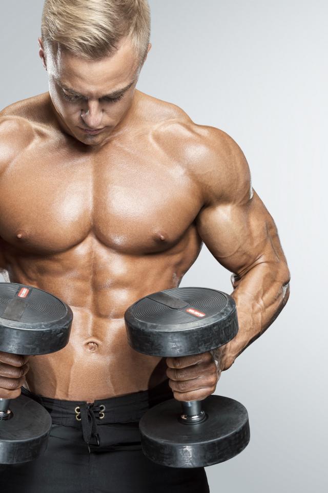 Wallpaper Inflated man with dumbbells in hands on gray background
