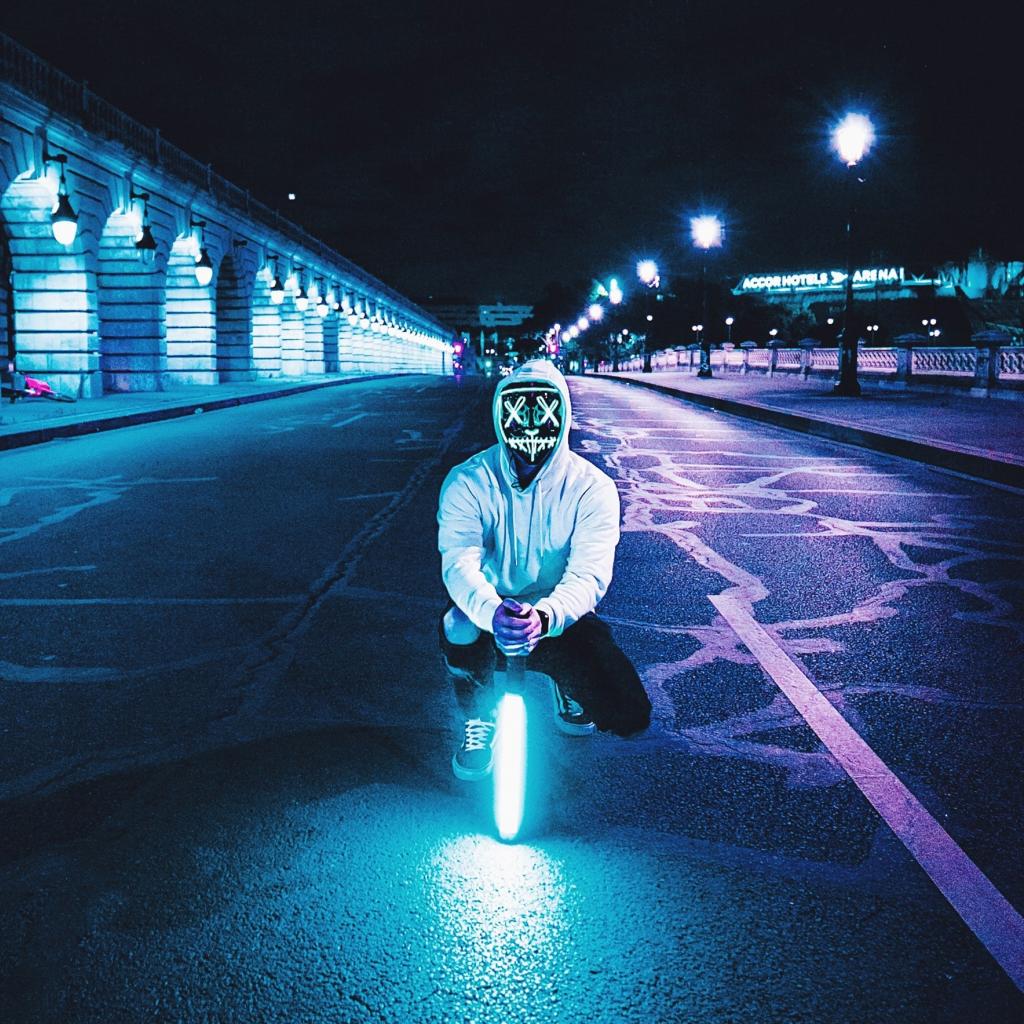 Wallpaper A guy in a luminous mask sits with a neon lamp on the road