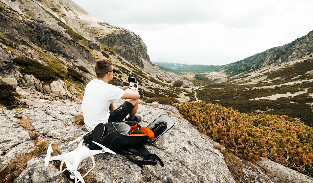 Wallpaper A guy with a quadcopter sits on a stone in the mountains