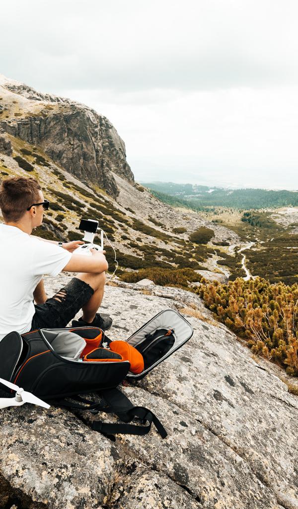 Wallpaper A guy with a quadcopter sits on a stone in the mountains