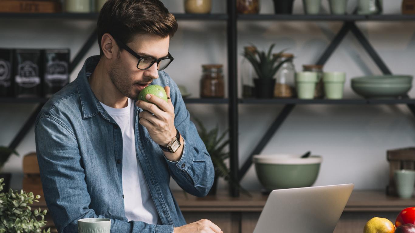 » Wallpaper A man with a laptop eats an apple in a cafe
