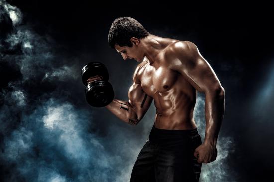 Wallpaper Inflated man with dumbbell in hand in smoke