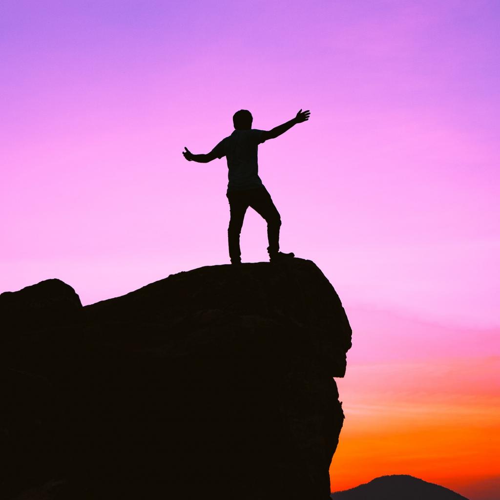 Wallpaper A man stands on the edge of a cliff at sunset