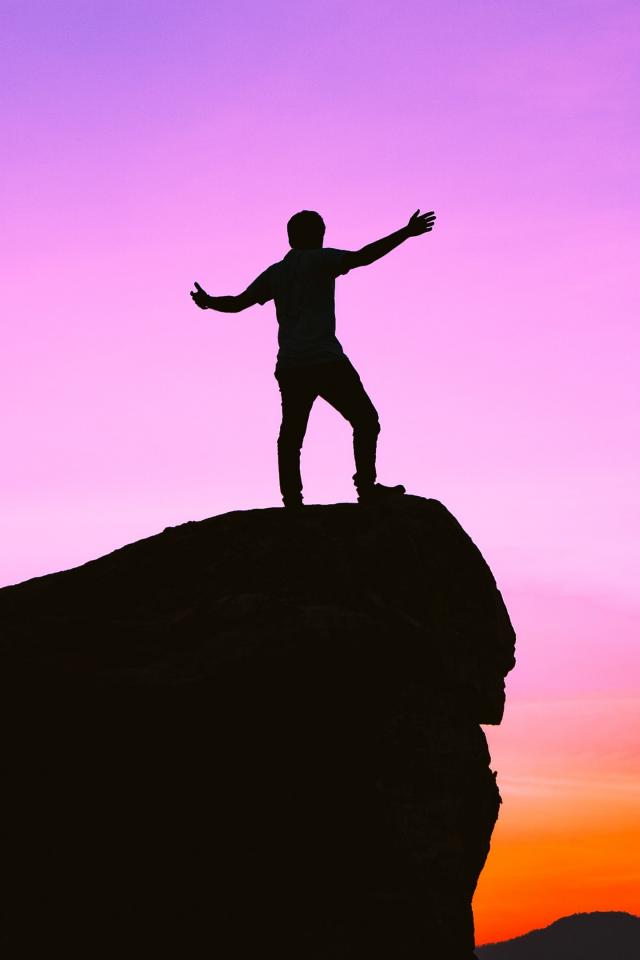 Wallpaper A man stands on the edge of a cliff at sunset