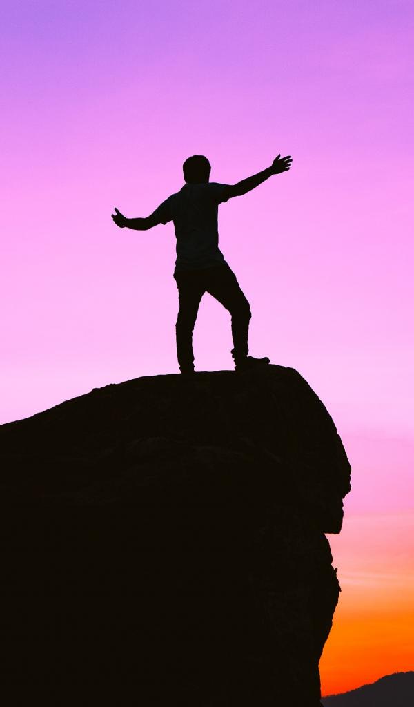 Wallpaper A man stands on the edge of a cliff at sunset