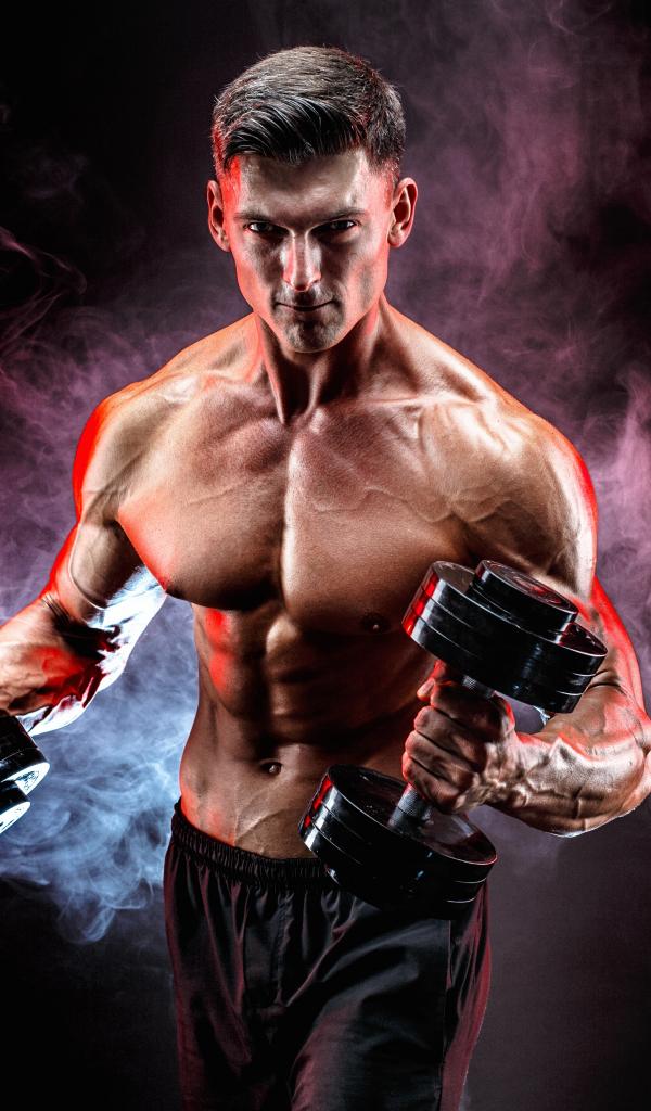 Wallpaper Muscular man with dumbbells in hands on a black background with smoke