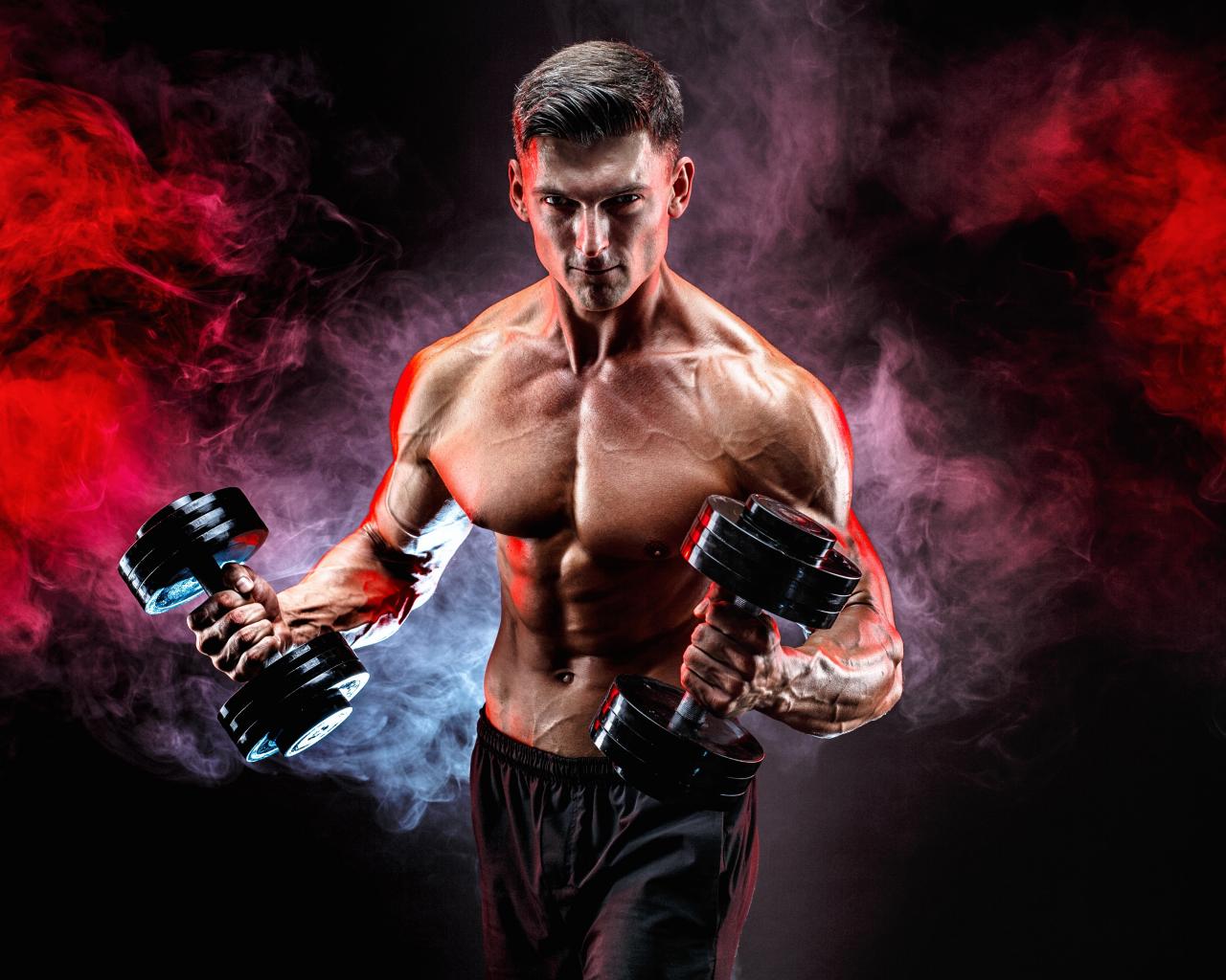 Wallpaper Muscular man with dumbbells in hands on a black background with smoke