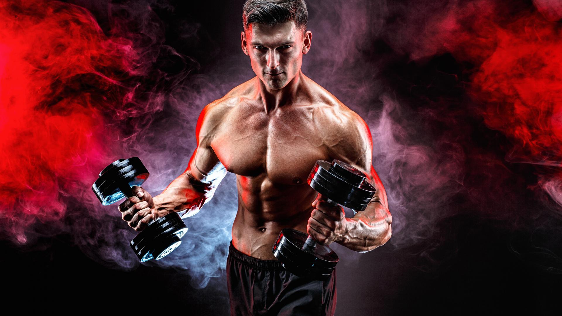 Wallpaper Muscular man with dumbbells in hands on a black background with smoke