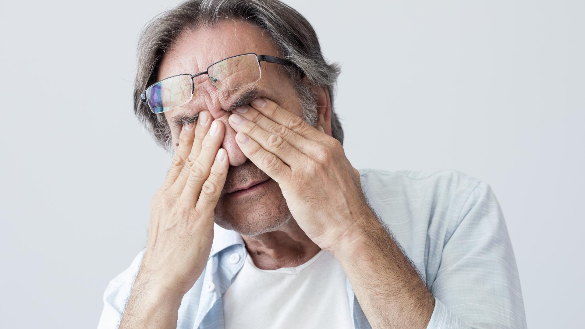 Wallpaper Elderly man rubs his eyes on a gray background