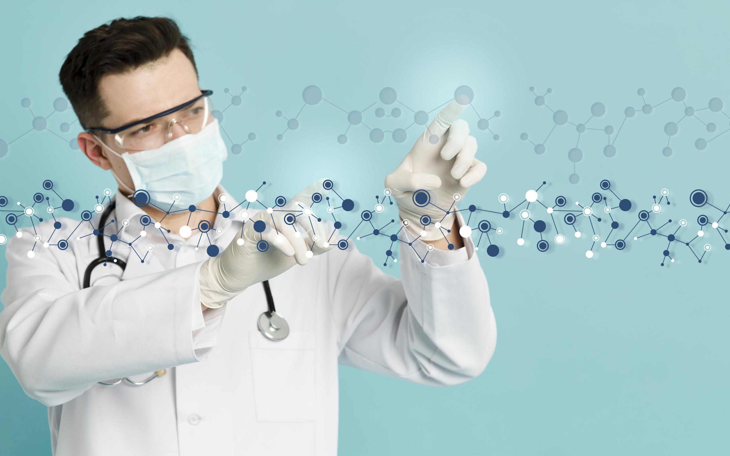 Wallpaper Male doctor examines molecules on a blue background