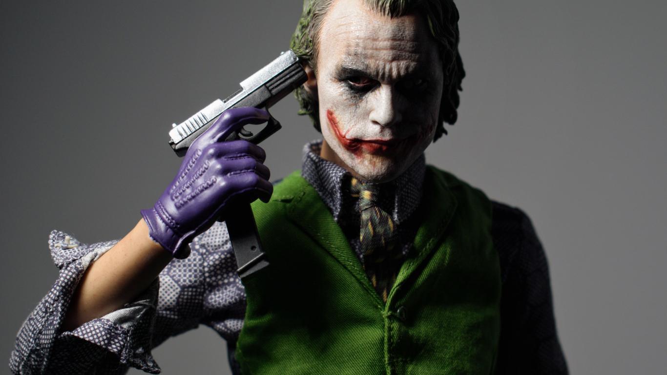 Wallpaper Character Joker with a gun in his hand on a gray background