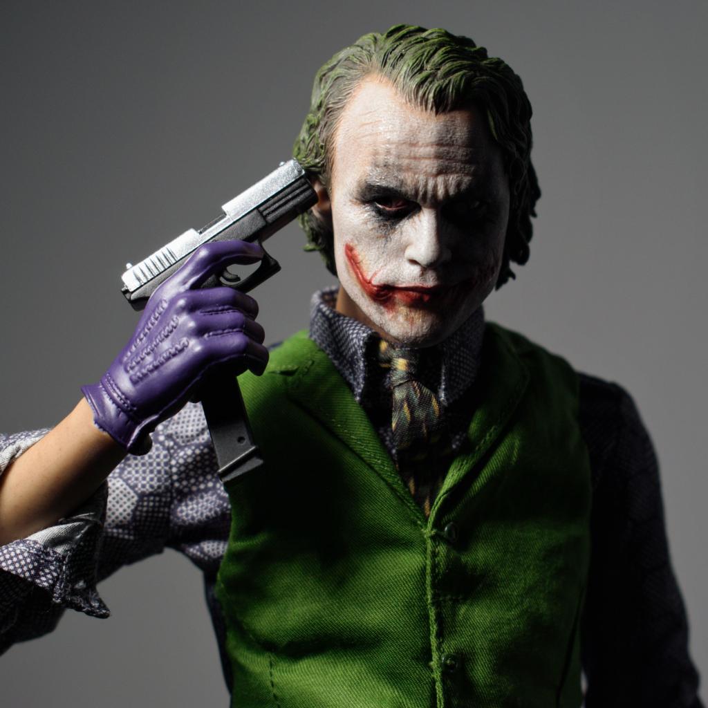 Wallpaper Character Joker with a gun in his hand on a gray background