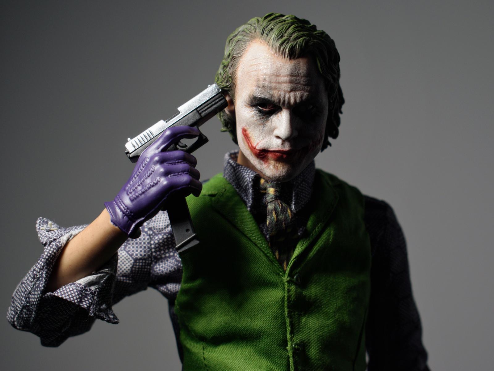 Wallpaper Character Joker with a gun in his hand on a gray background