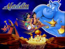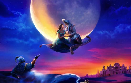 Wallpaper Aladdin and Jasmine on the carpet plane on the background of the moon