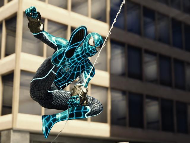 Wallpaper Spiderman flies on a web on a background of the house