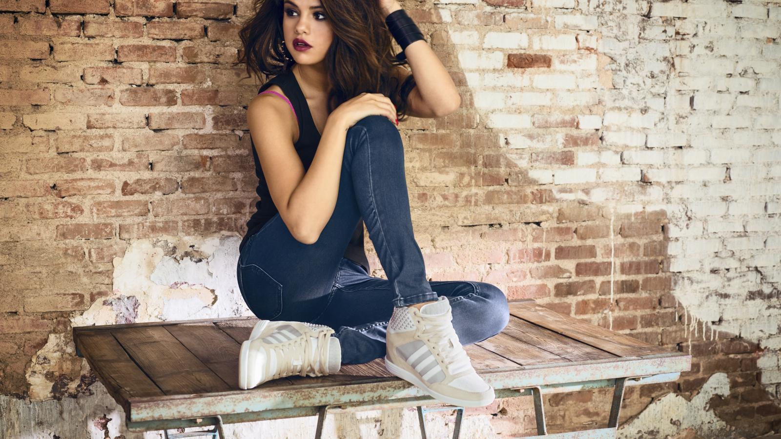 Wallpaper Young brunette singer Selena Gomez sits on the bench