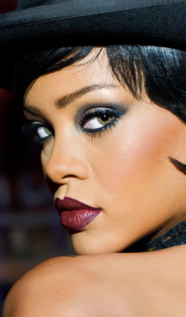 Wallpaper Famous singer Rihanna with a bright make-up in a black hat
