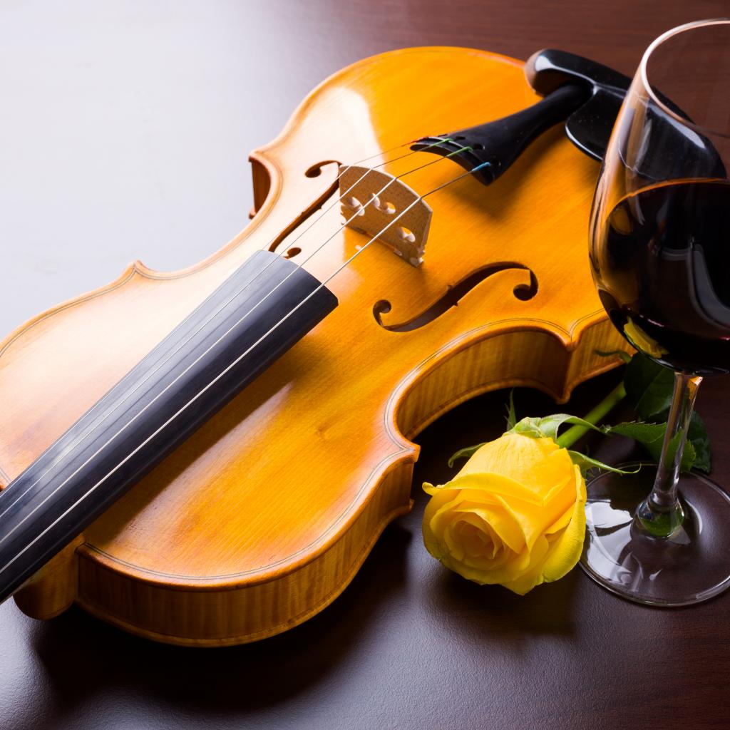Wallpaper Violin with a yellow rose and a glass of red wine
