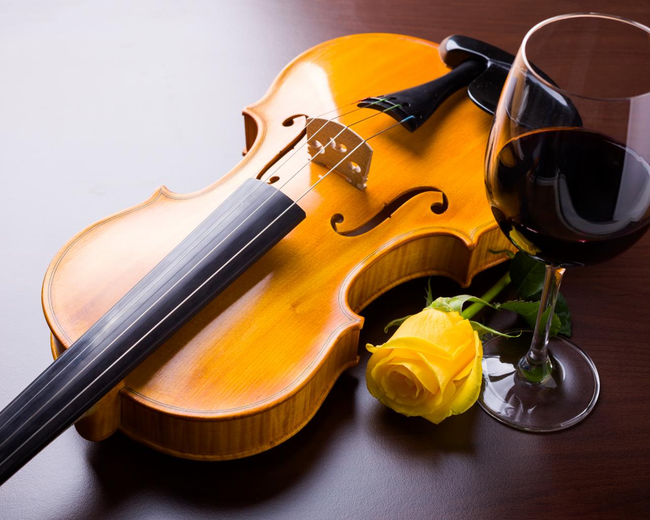 Wallpaper Violin with a yellow rose and a glass of red wine