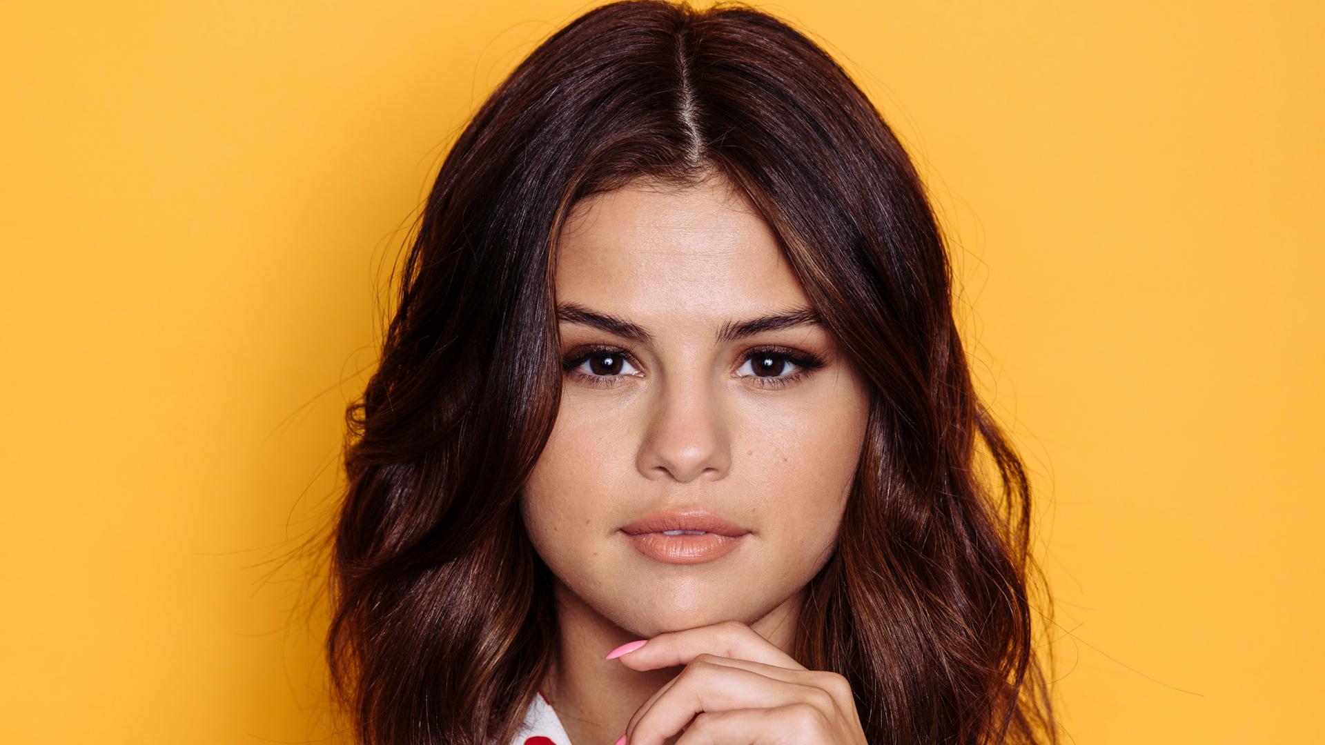 Wallpaper Young brunette singer Selena Gomez sits on the bench