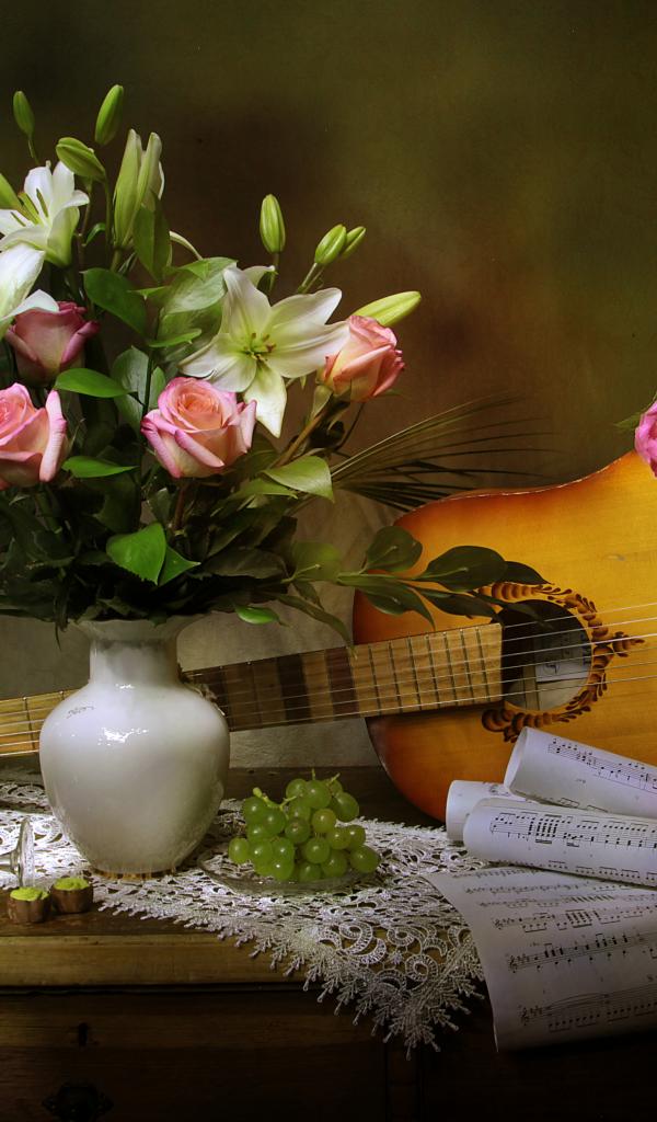 Wallpaper A bouquet of yellow roses on a table with a glass of wine