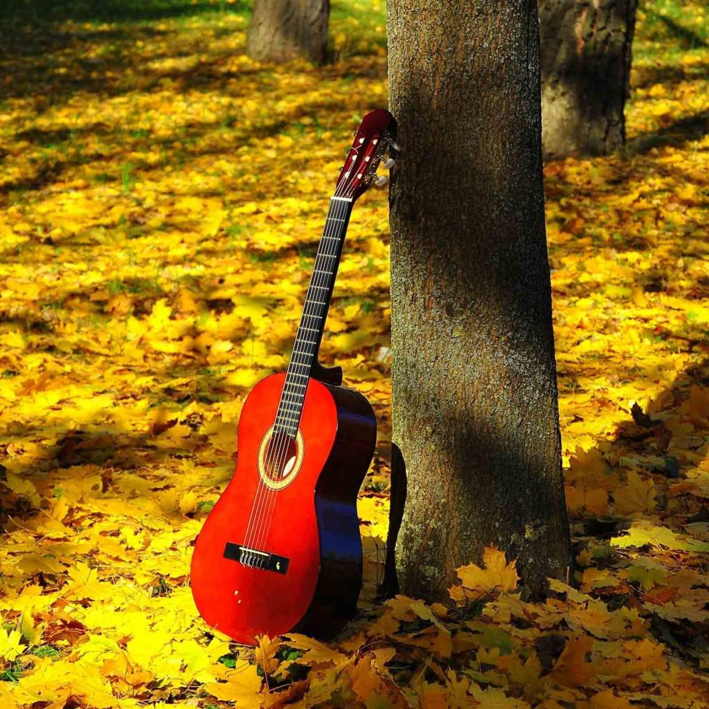 Wallpaper The red guitar stands by the tree on the fallen leaves in autumn