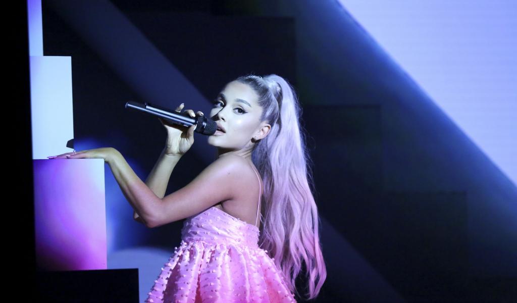 Wallpaper Singer Ariana Grande on stage with a microphone in a pink dress