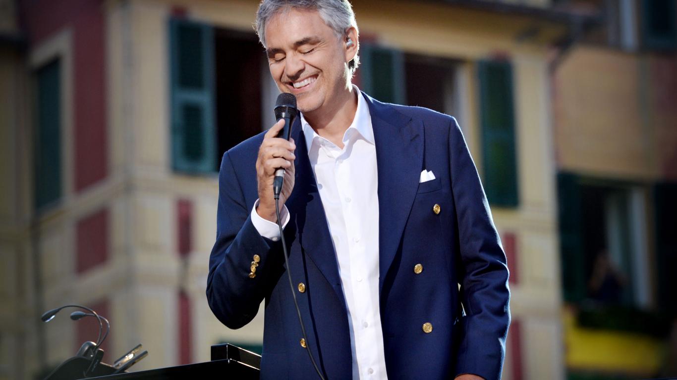 Wallpaper Italian singer Andrea Bocelli in a suit with a microphone