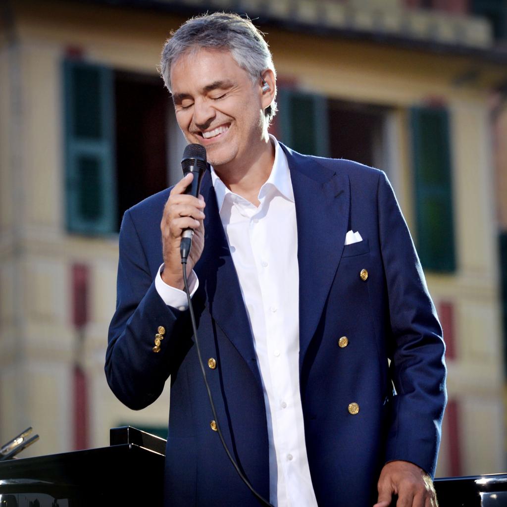 Wallpaper Italian singer Andrea Bocelli in a suit with a microphone