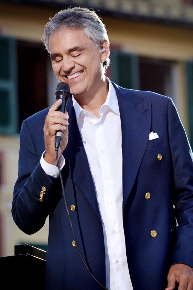 Wallpaper Italian singer Andrea Bocelli in a suit with a microphone