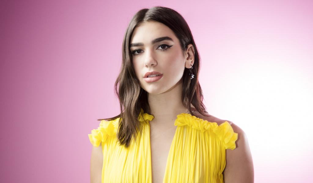 Wallpaper Cute girl singer Dua Lipa in a yellow dress on a pink background