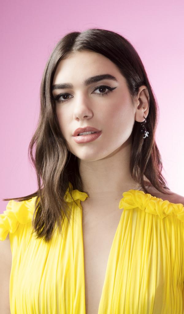Wallpaper Cute girl singer Dua Lipa in a yellow dress on a pink background