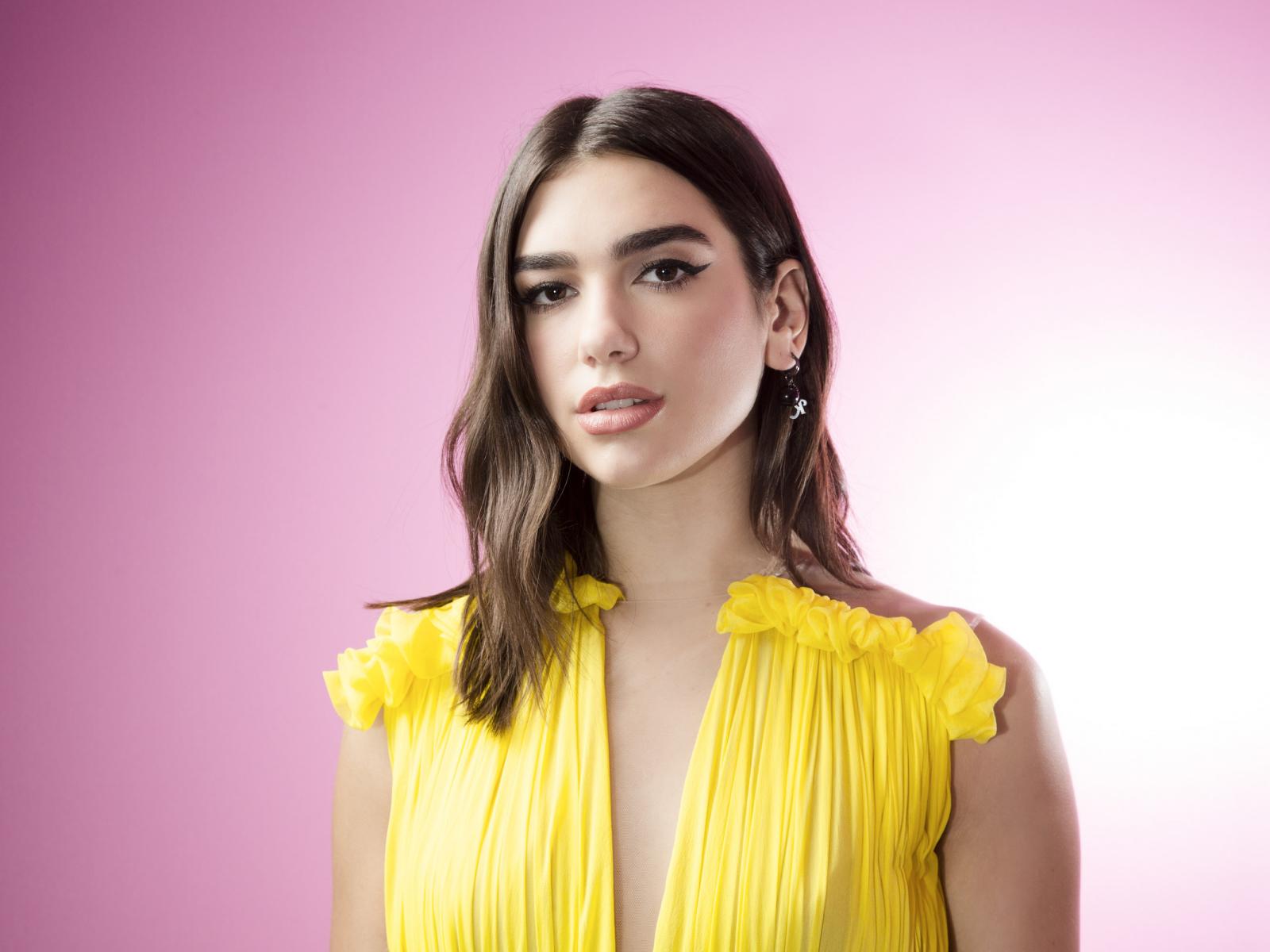 Wallpaper Cute girl singer Dua Lipa in a yellow dress on a pink background