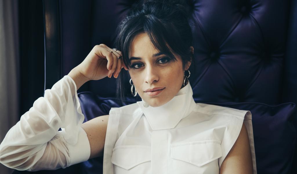 Wallpaper Stylish Camila Cabello in a white suit sits in a chair