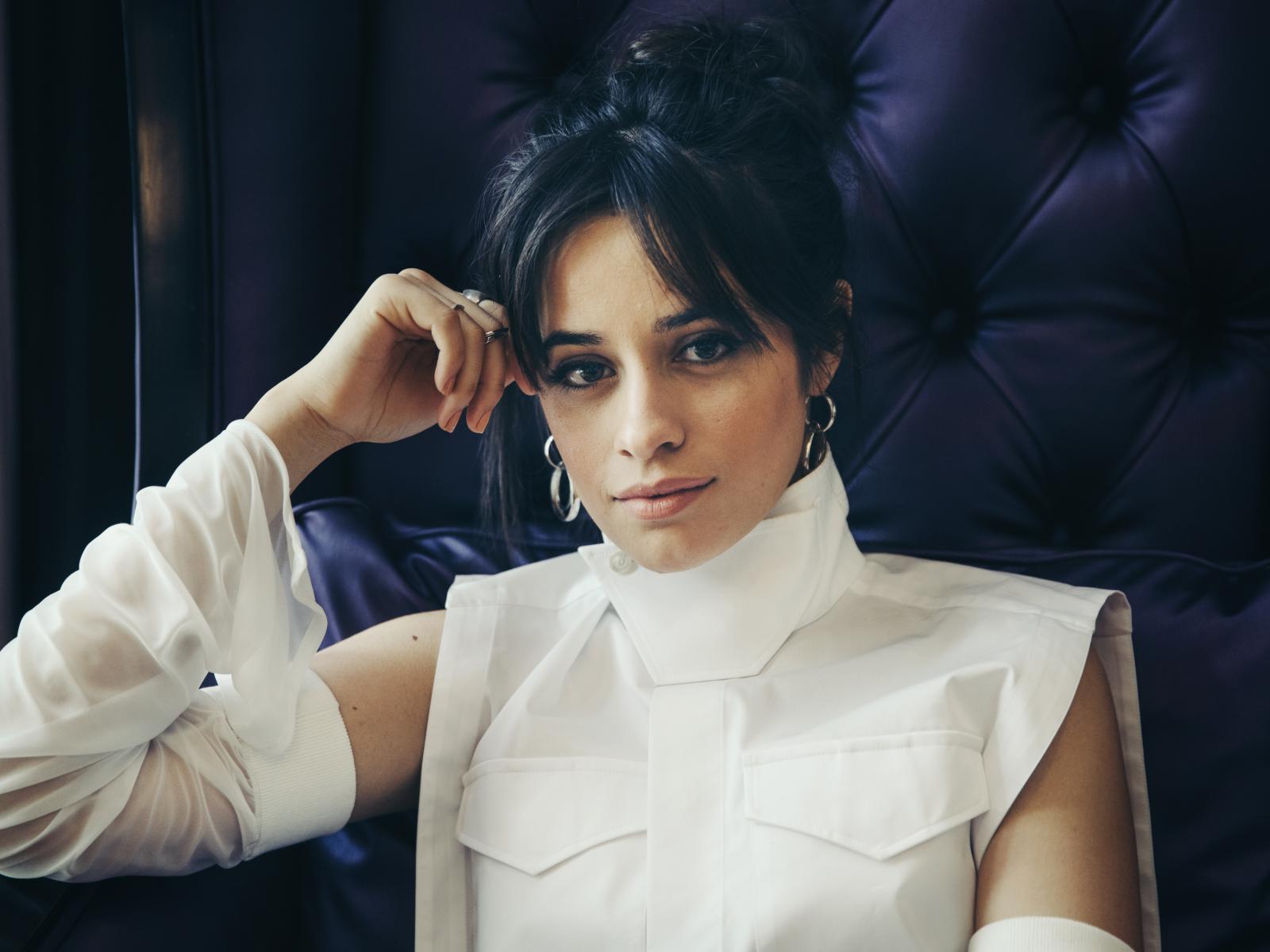 Wallpaper Stylish Camila Cabello in a white suit sits in a chair