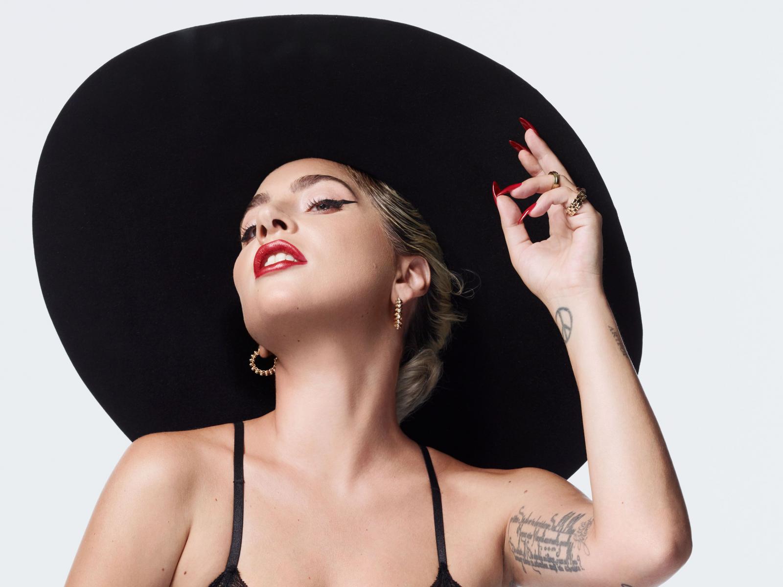 Wallpaper Singer Lady Gaga in a big black hat on a white background
