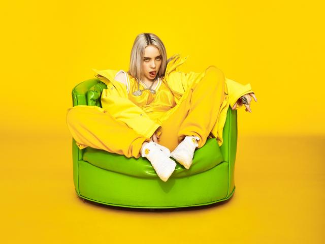 Wallpaper American singer Billy Ailish in a chair on a yellow background