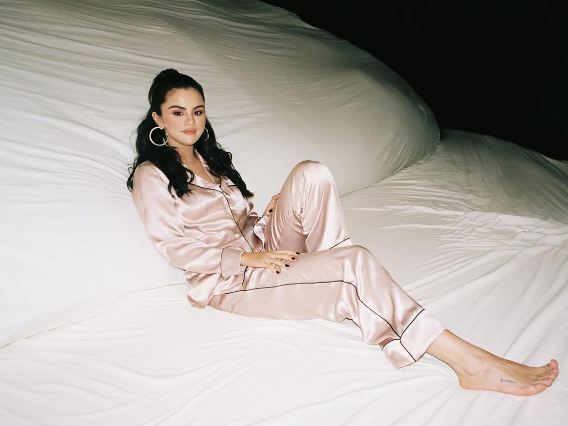 Wallpaper Singer Selena Gomez in pajamas on a large white bed