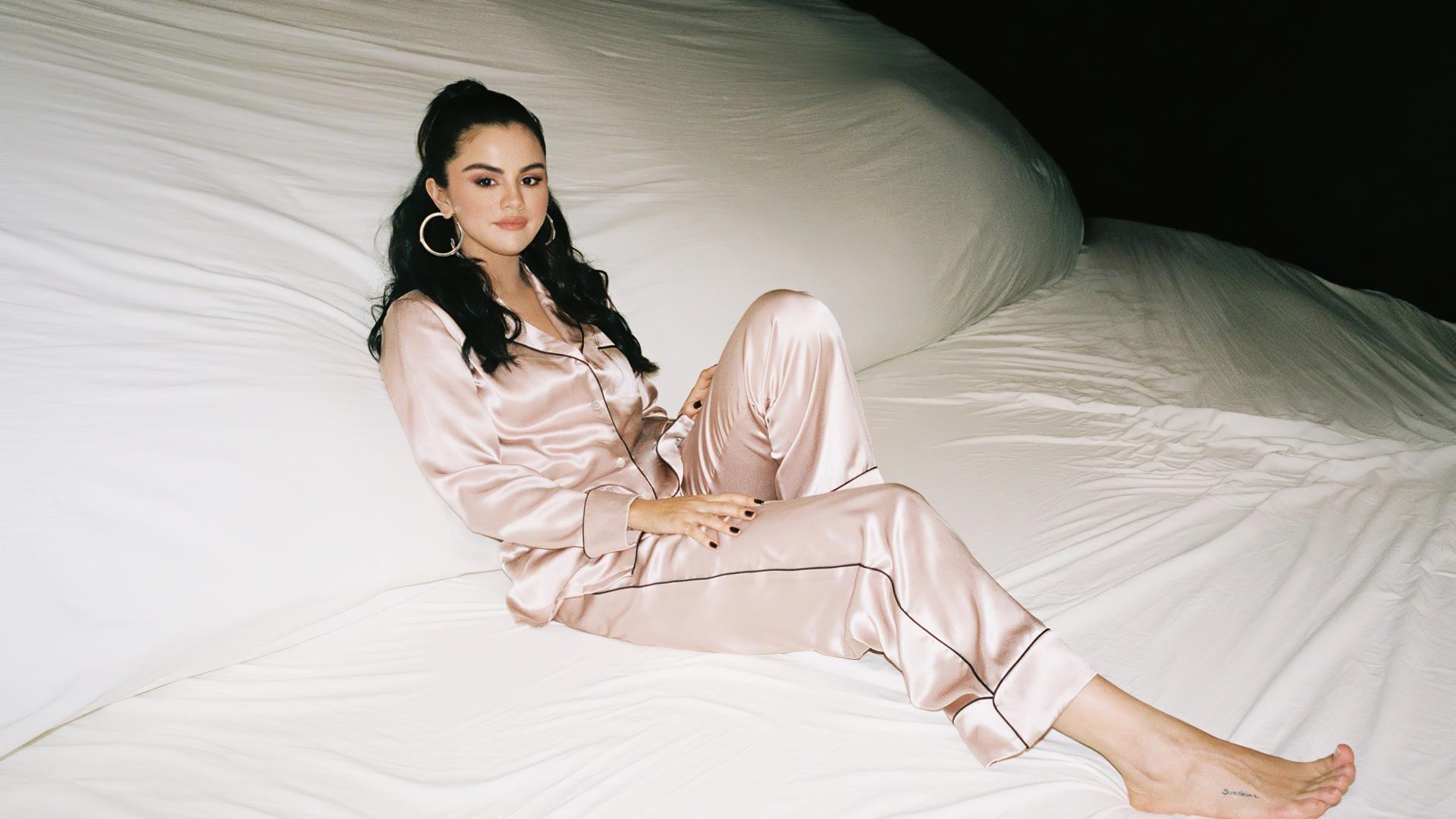 Wallpaper Singer Selena Gomez in pajamas on a large white bed