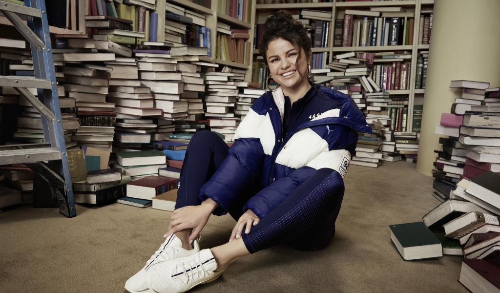 Wallpaper Smiling singer Selena Gomez in the library