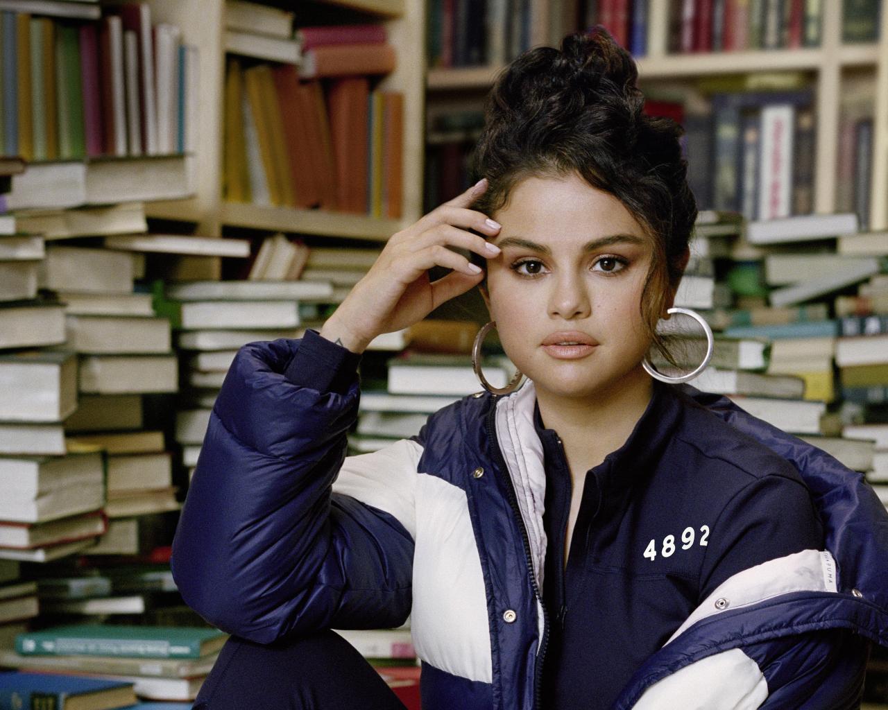 Wallpaper Actress and singer Selena Gomez in a jacket sits in a library