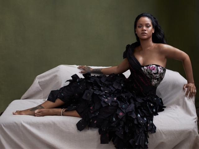 Wallpaper Singer Rihanna in a black dress on the couch