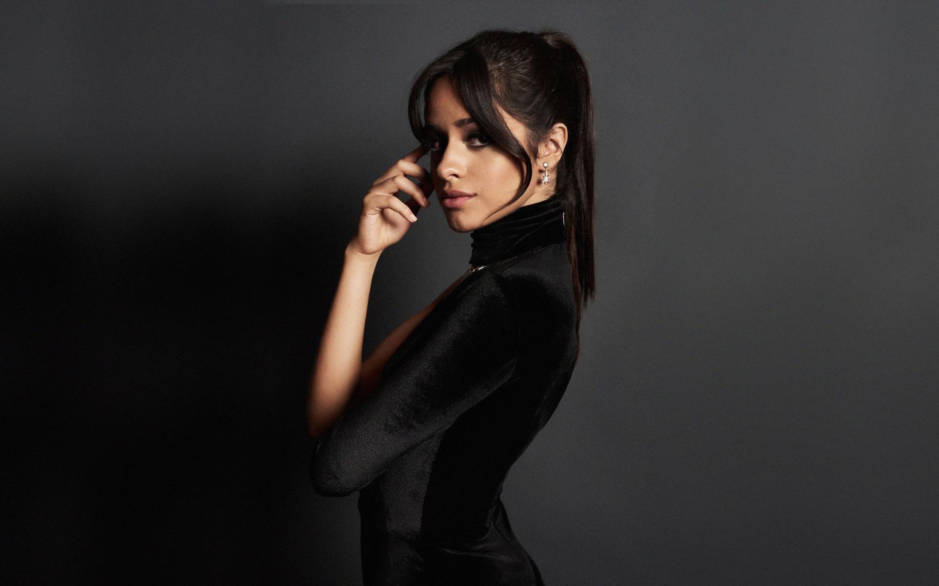 Wallpaper Young singer Camila Cabello in a black dress on a gray background