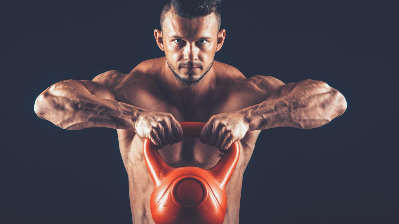 Wallpaper Inflated guy lifts a heavy weight on a black background