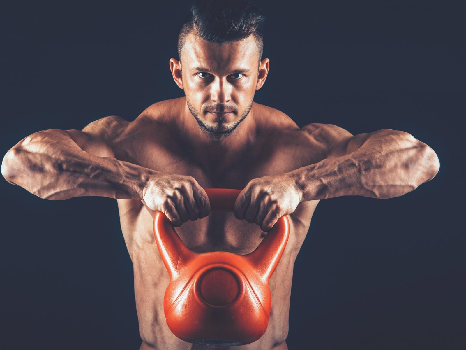 Wallpaper Inflated guy lifts a heavy weight on a black background