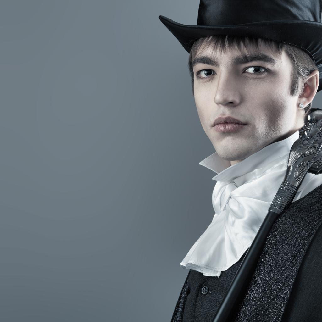 Wallpaper Handsome young man in black top hat and tailcoat on gray background.