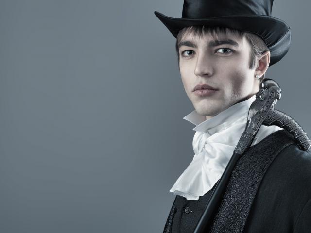 Wallpaper Handsome young man in black top hat and tailcoat on gray background.