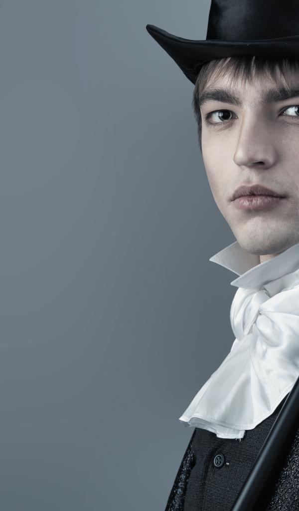 Wallpaper Handsome young man in black top hat and tailcoat on gray background.