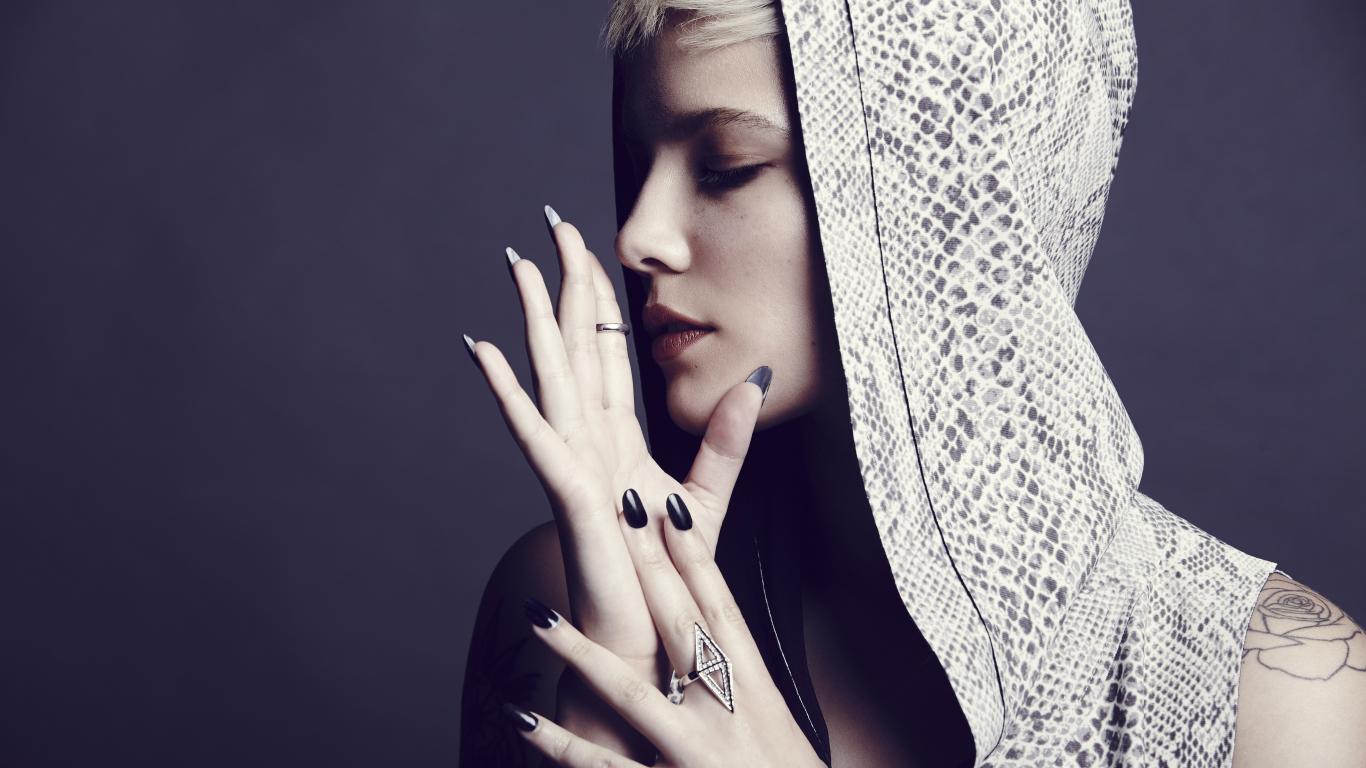 Wallpaper Singer Halsey in a hood on a gray background